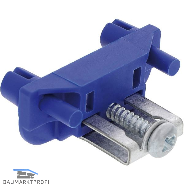 Stirnholzgreifender blauer Kunststoffsockel mit Klammer für Arbeitsplattenstärken ab 23 mm.