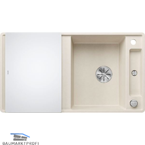 Lieferumfang:inkl. InFino® Drehknopf-Siebkorbüberlaufventil 3 1/2'', 1 Bohrloch durchgeschlagen, inkl. gelochte Edelstahlschale, inkl. Esche-Compound-Brückenschneidbrett