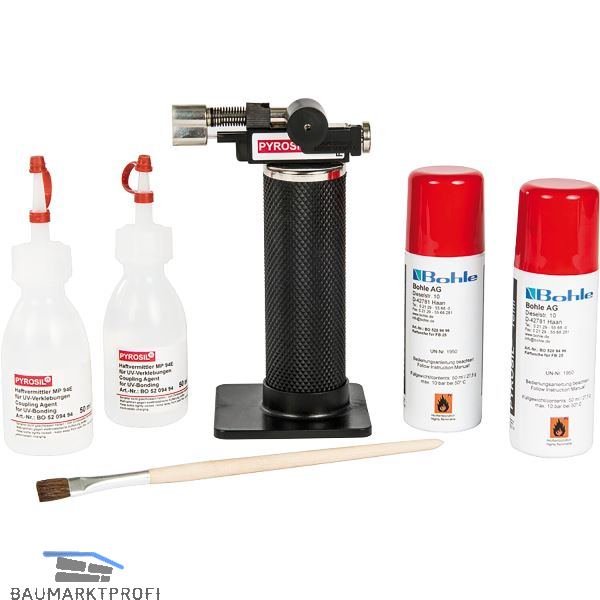Bohle Pyrosil® ist eine Spezial-Gasmischung zur Aktivierung der Oberflächen. In Verbindung mit dem mitgelieferten Pyrosil Primer wird ein optimaler Materialverbund erzielt. Die Verbindung wird durch den Einsatz dieses Systems vor Unterwanderung von Feuchtigkeit geschützt. Die Anhaftung des Klebstoffes wird stark verbessert. Durch das Verfahren wird mit Hilfe einer Brennerflamme ein Silikatsinter auf die Substratoberfläche aufgebracht. In einem zweiten Arbeitsschritt wird ein Haftvermittler aufgetragen, der mit dem Silikatsinter reagiert und bei der anschliessenden Verklebung eine feste chemische Verbindung mit dem Klebstoff eingeht. Eine so durchgeführte Verklebung ist langfristig vor Unterwanderung von Feuchtigkeit geschützt.