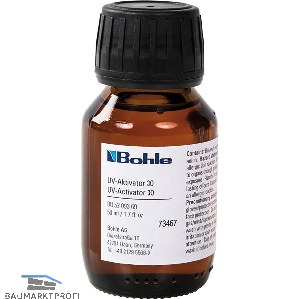 Mit dem Bohle UV-Aktivator 30 kann der UV-Klebstoff B-682T auch dort aushärten, wo dies mittels UV-Strahlung nicht möglich ist, z.B. bei Farbgläsern, Siebdruck beschichteten Gläsern, Verbundsicherheitsglas, Metall / Metall Verbindungen etc. Dünnschichtigen Auftrag beachten! Bei der Verwendung von Aktivator 30 wird die Verklebung immer leicht vergilben.