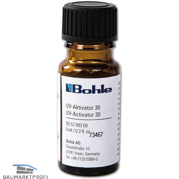 Mit dem Bohle UV-Aktivator 30 kann der UV-Klebstoff B-682T auch dort aushärten, wo dies mittels UV-Strahlung nicht möglich ist, z.B. bei Farbgläsern, Siebdruck beschichteten Gläsern, Verbundsicherheitsglas, Metall / Metall Verbindungen etc. Dünnschichtigen Auftrag beachten! Bei der Verwendung von Aktivator 30 wird die Verklebung immer leicht vergilben.