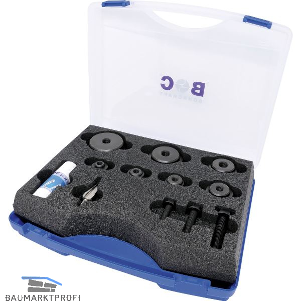 Lieferung inkl. Blechlocher ø 16,5 mm (M 16), 20,4 mm (M20/PG 13,5), 25,4 mm (M 25), 32,5 mm (M32), 40,5 mm (M 40), 50,5mm (M 50), 63,5 mm (M 63), Ersatzschraube MF10 x 1.0 / MF12 x 1.5 / MF16 x 1.5, Blechschälbohrer HSS Gr. 2 (6 - 20 mm), BP20 - Bohrpaste in Drehstift, 20 ml, im Kunststoffkoffer.