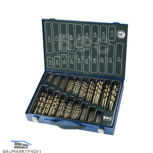 5% kobaltlegierter Universalbohrer mit Kreuzanschliff, sehr gut geeignet für den Einsatz in Handbohrmaschinen, ø um 0,5 mm steigend. In Kassette aus Stahlblech, lackiert.