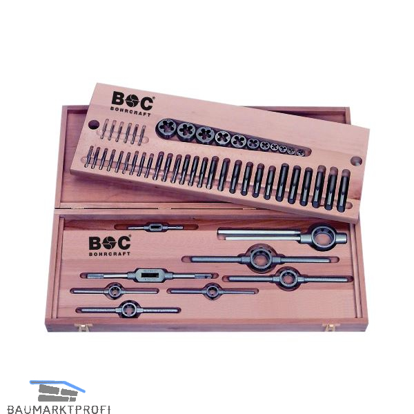 Marke: Bohrcraft Gewindegröße: M3 - M20 Gewindebohrer und Schneideisen: M 3 / 4 / 5 / 6 / 8 / 10 / 12 / 14 / 16 / 18 / 20 Schneideisenhalter: 20 x 5, 20 x 7, 25 x 9, 30 x 11, 38 x 14, 45 x 18 Windeisen Gr.: 1, 3 Satzgröße: 52-tlg. Material: HSSG Type: Code 6000