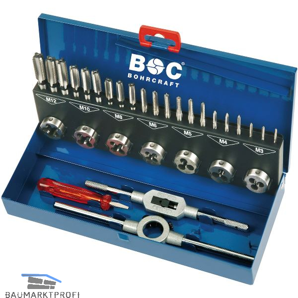 Marke: Bohrcraft Gewindegröße: M3 - M12 Gewindebohrer und Schneideisen: M 3 / 4 / 5 / 6 / 8 / 10 / 12, Haltewerkzeuge und Schraubendreher Schneideisenhalter: DIN 225 25 x 9 Windeisen Gr.: DIN 1814 Gr. 1,5 Satzgröße: 31-tlg. Material: HSSG Type: GS 25