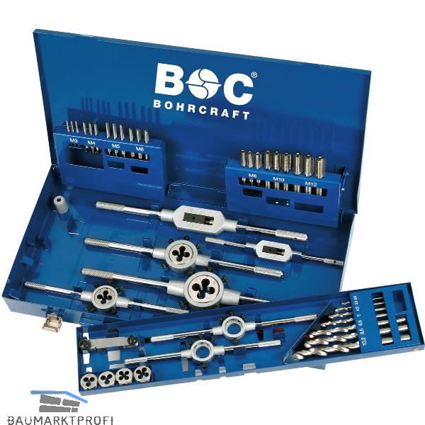 Gewindeschneid-Sortiment mit je einem Vor-, Mittel- und Fertigschneider. Profilgeschliffen und Flanken hinterschliffen. Rechtsschneidend. In Stahlblechkassette.