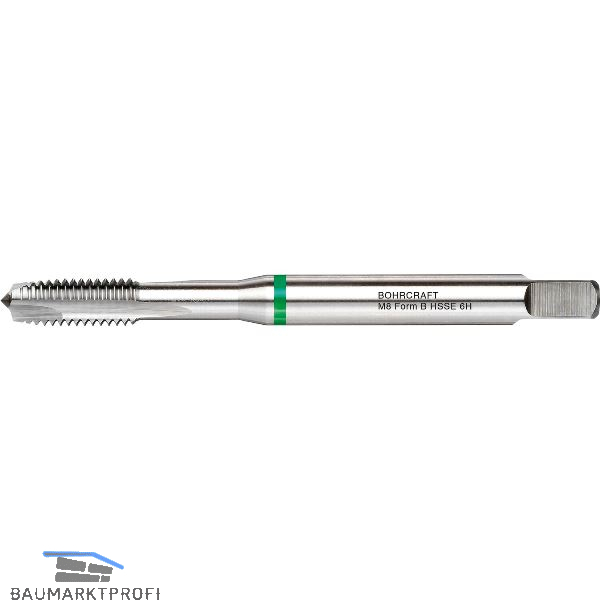 Form B = 4 - 5 Gang Anschnitt mit Schälanschnitt für Durchgangslöcher. Für Stähle bis 1000 N/mm², Temperguss, Aluminium, Kupfer und Thermoplaste.