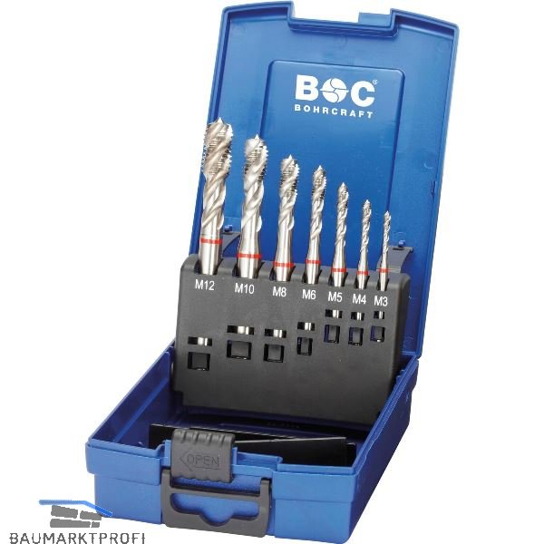 Lieferung inkl. Maschinengewindebohrer DIN 371 M3 / M4 / M5 / M6 / M8 / M10, DIN 376 M12, in Kunststoffkassette.