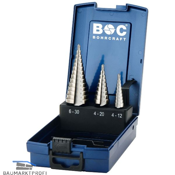 Marke: Bohrcraft Bohrer ø von bis (mm): 4 - 30 Inhalt: Gr. 1 (4,0-12,0), Gr. 2 (4,0-20,0), Gr. 3 (4,0-30,0) Satzgröße: 3-tlg. Material: HSS Aufnahme: Zylinderschaft Type: Code 1760