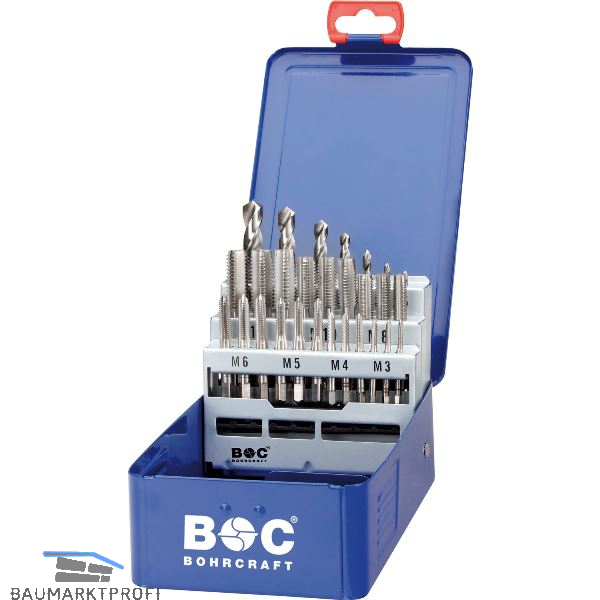 Gewindeschneid-Sortiment mit je einem Vor-, Mittel- und Fertigschneider. Profilgeschliffen und Flanken hinterschliffen. Rechtsschneidend. In Stahlblechkassette.
