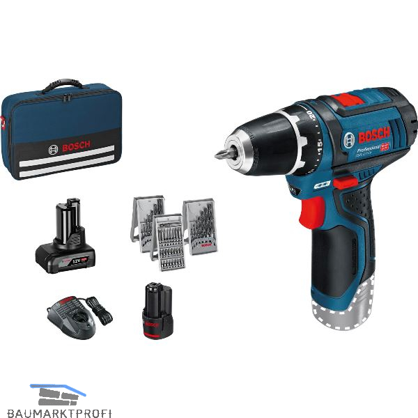 Lieferung inkl. 2 Akkus (Li-Ion) 1 x 2Ah, 1 x 4Ah, Schnellladegerät AL 1115 CV, 1-10 mm Schnellspannbohrfutter, 25-teiliges Schrauberbitset, 7-teiliges Holzbohrerset, 7-teiliges Metallbohrerset, in Handwerkertasche.