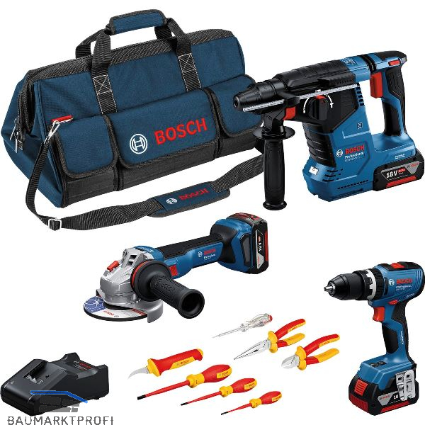 Lieferung inkl. 3 x ProCORE 18 Volt / 5,0 Ah Li-Ion Schiebe-Akkus und Schnellladegerät GAL 1880 CV, Schraubendrehersatz, Seitenschneider, Spitzzange, Kabelmesser, in Transporttasche.