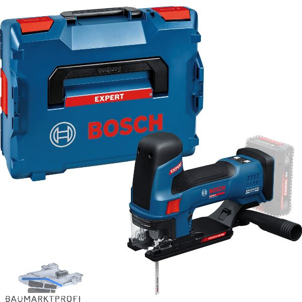 Lieferung inkl. Absaug-Set, 1x Stichsägeblatt T 308 BP, Spanreißschutz, L-Boxx-Einlage für Werkzeug und Ladegerät, in L-Boxx 136.