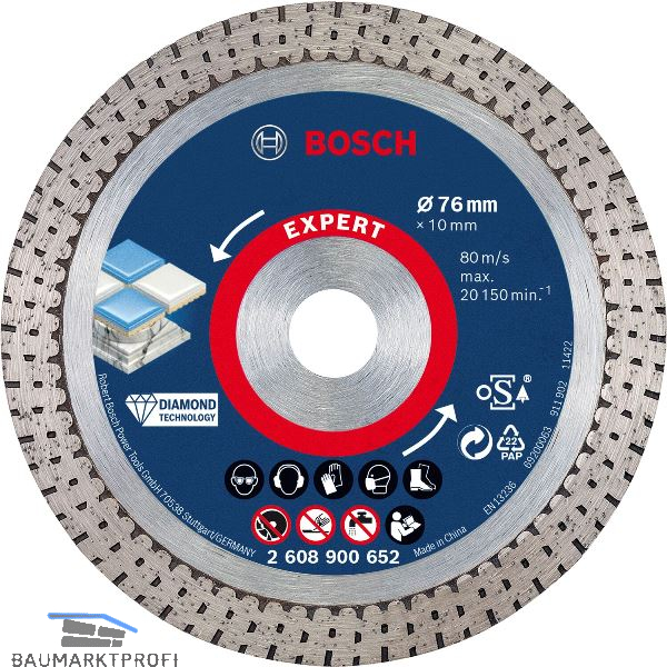 Hochpräzises Schneiden von Hartkeramikfliesen. Saubere, hochwertige Schnitte mit Bosch Diamond Technology. Materialschonendes Schneiden mit speziell entwickeltem durchgehendem Schneidrand.