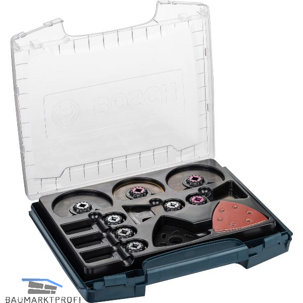 Set mit Starlock-Zubehören zum Sägen, für Tauchschnitte, zum Schleifen und zum Schaben verschiedener Materialen. Starlock-Zubehöre in transparenter Box mit eigenem Fach für sicheren Transport und schnellen Überblick.