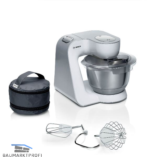 Zubehör: 1 x Deckel, 1 x Edelstahl-Rührschüssel, 1 x Knethaken, 1 x Rührbesen, 1 x Schlagbesen, 1 x Zubehörtasche dunkelgrau