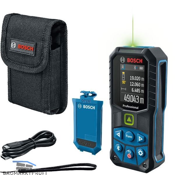 Widerstandsfähiges Design, das rauen Bedingungen standhält und eine schnelle Dokumentation sowie einfache Bedienung ermöglicht. Grüne Lasertechnologie garantiert exzellente Sichtbarkeit zum Messen großer Distanzen bei hellen Innenraumbedingungen. Schlagabsorbierendes Gehäuse übersteht Stürze aus 1,5 Meter Höhe, sogar auf harten Beton. Schneller Datentransfer über Bluetooth®-Konnektivität und Bosch MeasureOn App. Intuitives Handling durch intelligentes User Interface mit hochmodernem Farbdisplay und praktischer Hilfsfunktion. Eignet sich ideal zum Dokumentieren, Berechnen des Materialbedarfs, Berechnen von Räumen und Wandflächen und Positionieren von Befestigungselementen. Bietet eine längere Akkulaufzeit (im Vergleich zum Vorgänger GLM 50 C Professional) und sowohl ein Akustik- als auch Vibrationssignal zur Bestätigung erfolgreicher Messungen.