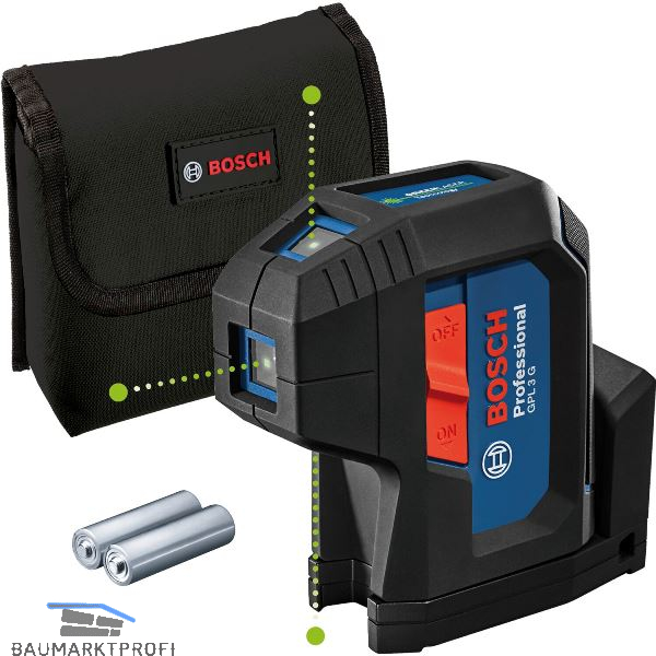 3-Punkt-Laser GPL 3 G Professional ideal für den Trockenbau. Grüne Laserpunkte bieten bis zu viermal bessere Sichtbarkeit als rote Punkte. Gummiummanteltes Gehäuse mit eingelassenen Glas. Staub- und Spritzwasserschutz nach IP 65. Ausgestattet mit eingebauter Drehhalterung mit starken Magneten für eine schnelle und sichere Werkzeugbefestigung und bequemen Transport. Der ideale Helfer für die Übertragung von Referenzpunkten vom Boden zur Decke, z. B. bei der Installation von Innenraumbeleuchtung. Durch seine Formgebung eignet er sich perfekt für die Ausrichtung von Trockenwandunterkonstruktionen. Verfügt über ein benutzerfreundliches Interface mit Zweipositionsschalter. Beim Einschalten nivelliert der Laser sich automatisch selbst, beim Ausschalten wird die Pendelarretierung aktiviert.