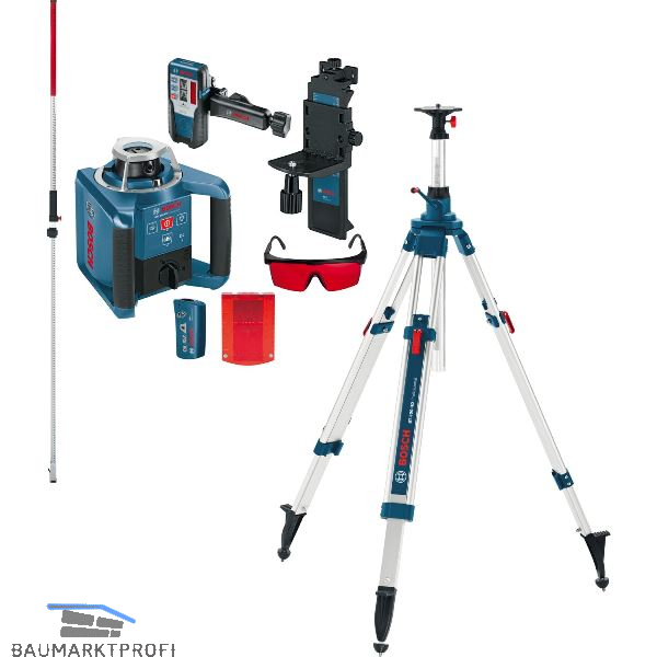 1 x Akku NiMH, Ladegerät-Set mit Adapter, Batteriegehäuse, Laserzieltafel, Laser-Sichtbrille, Kurbelstativ BT 300 HD, Messlatte GR 240, Koffer.