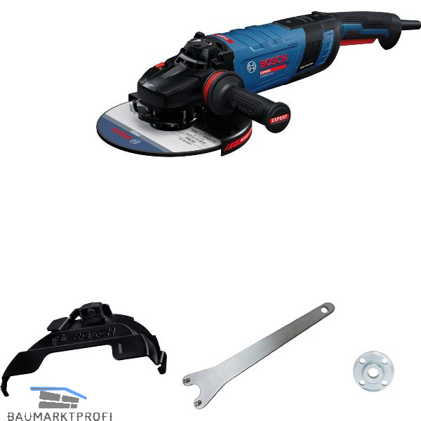 Lieferung inkl. Spannmutter, Zweilochmutterndreher, Vibration Control-Zusatzgriff, Anklippbare Trennschutzhaube aus Metall, Schnellverstellbare Schutzhaube, im Karton.