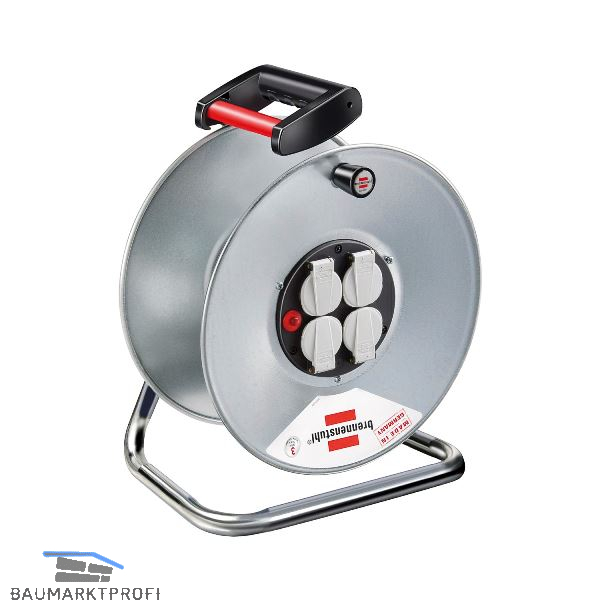 Trommelkörper Stahlblech, rostgeschützt verzinkt, auf besonders stabilem Tragegestell. Ergonomischer Handgriff mit Achse für perfekte Kabelführung beim Auf- und Abrollen. Überhitzungsschutz, Kontroll-Leuchte bei Überhitzung und Überlastung. Stecker, 4 Steckdosen 230V (DE mit Schutzkappen).