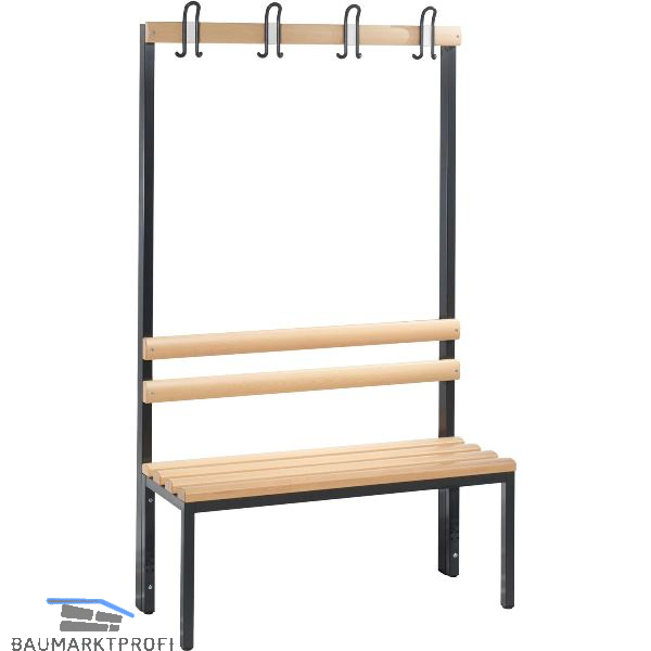 Die einseitige Garderobenbank "Basic" ist ein robustes und funktionales Möbelstück, ideal für Umkleideräume oder Eingangsbereiche. Das Gestell besteht aus stabilem Vierkant-Stahlrohr und ist mit verstellbaren Bodengleitern ausgestattet, um einen einfachen Niveauausgleich zu ermöglichen. Inklusive sind eine Rückenlehne und eine Garderobenleiste mit acht verdeckten Kunststoff-Doppelhaken. Die Sitzleisten bestehen aus Buche-Hartholz und sind klarlackiert, um natürlichen Farbunterschieden gerecht zu werden. Gestell in RAL 7021 Schwarzgrau bietet die Bank sowohl Komfort als auch Langlebigkeit.