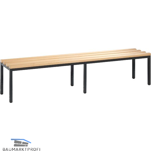Die freistehende Sitzbank "Basic" verfügt über ein Gestell mit sechs Füßen, das aus stabilem Vierkant-Stahlrohr gefertigt ist. Die Bodengleiter sind verstellbar, was einen einfachen Niveauausgleich ermöglicht. Die Sitzleisten bestehen aus Buche-Hartholz und sind allseitig gehobelt und oben abgerundet, um einen guten Sitzkomfort zu gewährleisten. Die Leisten sind klarlackiert, wobei naturgegebene Farbunterschiede auftreten können. Das Gestell ist in der Farbe RAL 7021 Schwarzgrau gehalten. Die Sitzbank ist extrem belastbar für höchste Beanspruchung.