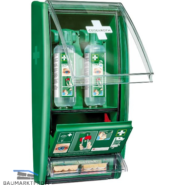 Die Augenspül-Station enthält extra Platz für Produkte wie z.B. Blutstiller, Schutzbrille oder Schutzhandschuhe. Die transparente Klappe erleichtert das Nachfüllen der Augendusche.