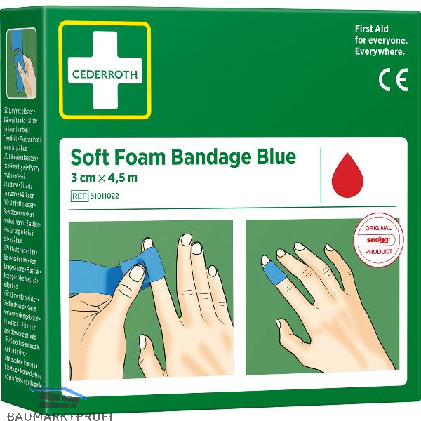 Cederroth Soft Foam Bandage - Rolle, die als Pflaster und Bandage funktioniert. Der Verband passt für alle Typen von kleinen Wunden, unabhängig von Wärme, Kälte, nass oder trocken und hält auch im Wasser. Cederroth Soft Foam Bandage haftet von selbst, ohne Kleber und klebt deshalb nicht auf der Haut oder im Haar fest. Reißen Sie einfach ein passendes Stück ab und legen Sie es ein- oder zweimal um die Verletzung. Bei kräftiger Blutung formen Sie ein Stück Soft Foam Bandage wie ein „Kissen“, um einen Druckverband zu schaffen. Enthält Latex.