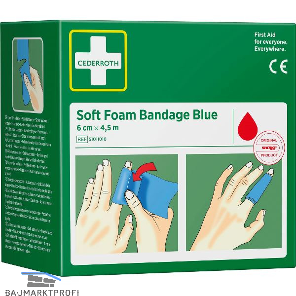 Cederroth Soft Foam Bandage - Rolle, die als Pflaster und Bandage funktioniert. Der Verband passt für alle Typen von kleinen Wunden, unabhängig von Wärme, Kälte, nass oder trocken und hält auch im Wasser. Cederroth Soft Foam Bandage haftet von selbst, ohne Kleber und klebt deshalb nicht auf der Haut oder im Haar fest. Reißen Sie einfach ein passendes Stück ab und legen Sie es ein- oder zweimal um die Verletzung. Bei kräftiger Blutung formen Sie ein Stück Soft Foam Bandage wie ein „Kissen“, um einen Druckverband zu schaffen. Enthält Latex.