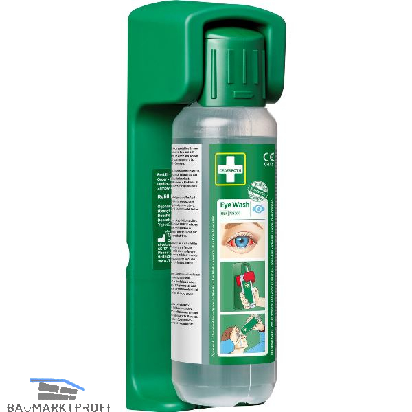 Robuste und praktische Wandhalterung für Augendusche 500 ml. Die Flasche ist in der Wandhalterung arretiert und öffnet sich automatisch, wenn man sie aus der Halterung dreht - die Augenspülung kann unmittelbar beginnen. Eine nachleuchtende Anleitungstafel liegt bei.