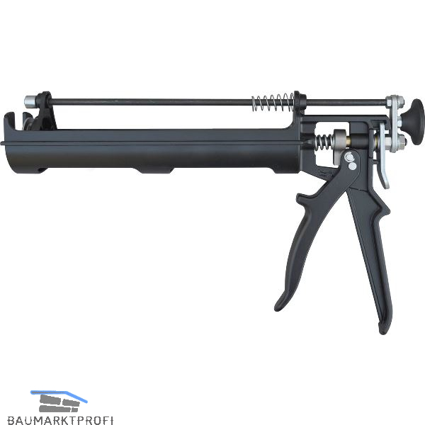 Stabile Auspresspistole aus Metall: Gewichteinsparung durch Einsatz von Magnesium. Reduzierter Kraftaufwand durch verbesserte Übersetzung von 1:25 erleichtert das Auspressen. Geeignet für Side-by-side Kartuschen mit 345 ml Inhalt oder Standardkartuschen mit 165 ml, 280 ml, 300 ml. Die obere Schubstange dient als Zeiger.
