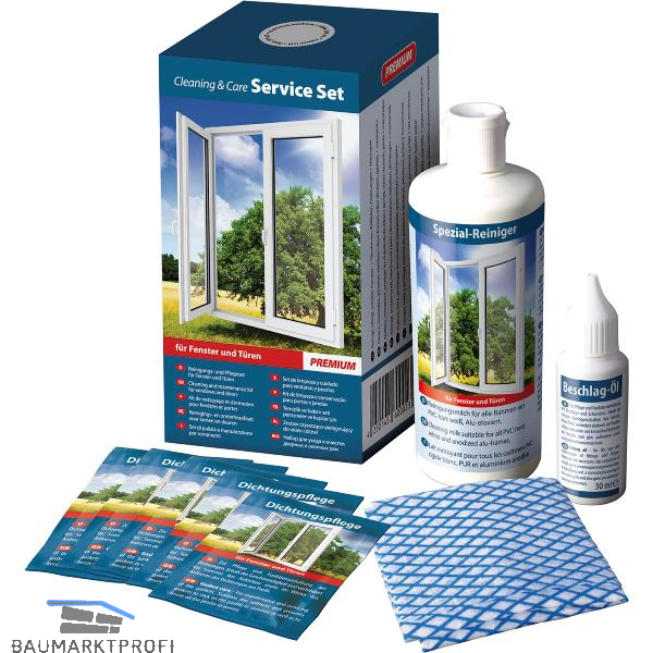 Set zur Reinigung, Pflege, Schutz und Funktionserhaltung von Fenster, Türen, Rollläden, Dichtungen und Mechanik.