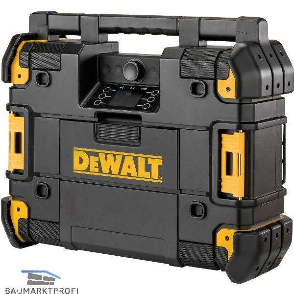 Robustes Baustellenradio mit Netz- und Akku-Betrieb sowie mit Akku- Ladefunktion. Verbindung mit den gleichen Clips wie T-STAK-Boxxen, daher kompatibel. Mit rauschfreiem DAB+ und FM-Stereo Empfang, Farbdisplay. Bedienbar mit mobiler App über Bluetooth. 4+1+1 Lautsprecher. Subwoofer, Leistung 45 Watt RMS. Funktioniert mit allen DeWalt Akkus einschließlich FlexVolt.