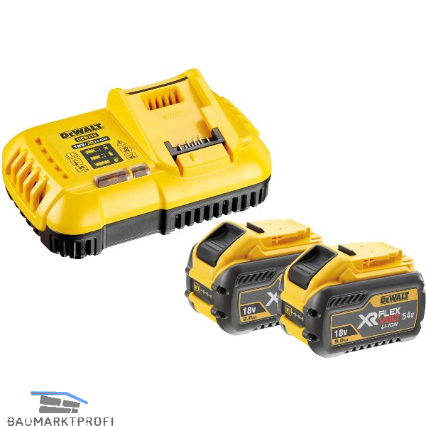 Lieferung inkl. 2 x DCB 547 18/54 Volt / 9,0 Ah Li-Ion Flexvolt Schiebe-Akkus und DCB118 System-Schnellladegerät.