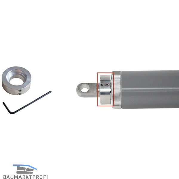 Die Verstellsicherung wird über das Auge des Türschließers geschoben und dann mit 2 Madenschrauben gesichert. Der Druck auf das Rändelrad verhindert ein unbefugtes Verdrehen der Regulierung/Einstellung. Diese Sicherung kann bei bestehenden Türschließern DIREKT II 150 einfach nachgerüstet werden.