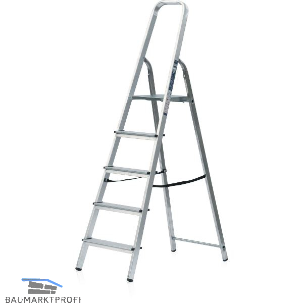 Stufen-Stehleiter für den täglichen Gebrauch, extrem leicht. Ab 6 Stufen Knotenkette bzw. Gurtband als Spreizsicherung. Stufentiefe: 80 mm. Tragkraft 150 kg.