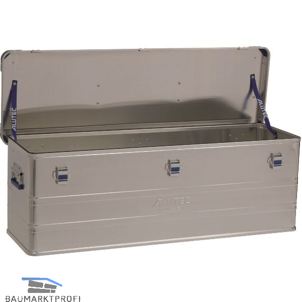Box aus 1,0 mm starkem Aluminium und robusten Stapelecken aus schlagfestem Kunststoff. Stabiler Klappdeckel mit Fangbändern, die ein Ausreißen der Scharniere verhindern, leicht, stabil und formbeständig durch umlaufende Sicken. Korrosions-, witterungs- und temperaturbeständig. Selbsteinklappende und kunststoffummantelte Sicherheitshandgriffe für bequemen Transport. Stabile Hebelspannverschlüsse mit Bohrungen für Vorhängeschloss oder Plombenverschluss, sowie Vorbereitung zur Montage von Zylinderschlössern, eine umlaufende Gummidichtung im Kastenprofil schützt den Inhalt vor Staub und Spritzwasser.