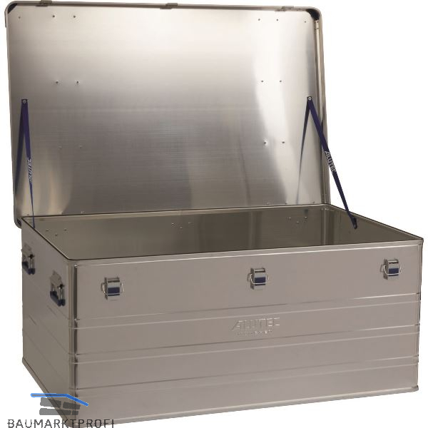 Box aus 1,0 mm starkem Aluminium und robusten Stapelecken aus schlagfestem Kunststoff. Stabiler Klappdeckel mit Fangbändern, die ein Ausreißen der Scharniere verhindern, leicht, stabil und formbeständig durch umlaufende Sicken. Korrosions-, witterungs- und temperaturbeständig. Selbsteinklappende und kunststoffummantelte Sicherheitshandgriffe für bequemen Transport. Stabile Hebelspannverschlüsse mit Bohrungen für Vorhängeschloss oder Plombenverschluss, sowie Vorbereitung zur Montage von Zylinderschlössern, eine umlaufende Gummidichtung im Kastenprofil schützt den Inhalt vor Staub und Spritzwasser.
