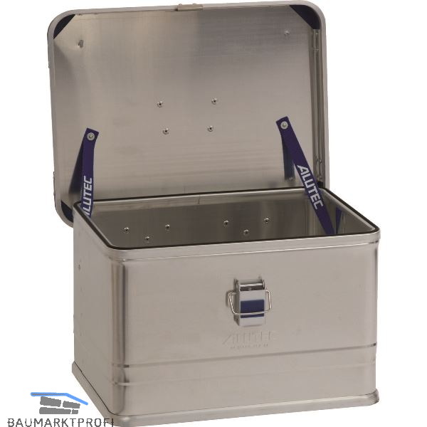 Box aus 1,0 mm starkem Aluminium und robusten Stapelecken aus schlagfestem Kunststoff. Stabiler Klappdeckel mit Fangbändern, die ein Ausreißen der Scharniere verhindern, leicht, stabil und formbeständig durch umlaufende Sicken. Korrosions-, witterungs- und temperaturbeständig. Selbsteinklappende und kunststoffummantelte Sicherheitshandgriffe für bequemen Transport. Stabile Hebelspannverschlüsse mit Bohrungen für Vorhängeschloss oder Plombenverschluss, sowie Vorbereitung zur Montage von Zylinderschlössern, eine umlaufende Gummidichtung im Kastenprofil schützt den Inhalt vor Staub und Spritzwasser.