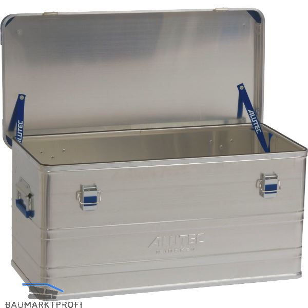 Box aus 1,0 mm starkem Aluminium und robusten Stapelecken aus schlagfestem Kunststoff. Stabiler Klappdeckel mit Fangbändern, die ein Ausreißen der Scharniere verhindern, leicht, stabil und formbeständig durch umlaufende Sicken. Korrosions-, witterungs- und temperaturbeständig. Selbsteinklappende und kunststoffummantelte Sicherheitshandgriffe für bequemen Transport. Stabile Hebelspannverschlüsse mit Bohrungen für Vorhängeschloss oder Plombenverschluss, sowie Vorbereitung zur Montage von Zylinderschlössern, eine umlaufende Gummidichtung im Kastenprofil schützt den Inhalt vor Staub und Spritzwasser.