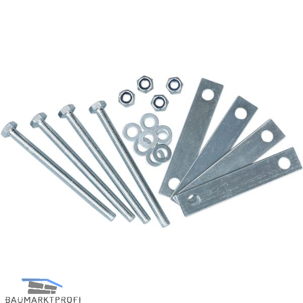Lieferung inkl. 4 Schrauben M10 x 140 mm, 4 Verbindungsplatten, 4 Muttern, 8 Unterlegscheiben, 1 Montageanleitung.