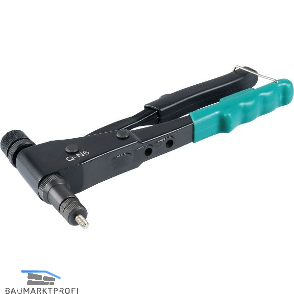 Einstiegs-Hebel-Blindnietmuttern-Setzgerät. Die Feder schiebt den Hebel automatisch heraus, für eine einfache Verwendung. Umrüstsätze für Blindnietmuttern und Zugbolzen für Blindnietschrauben sind enthalten und einfach austauschbar.