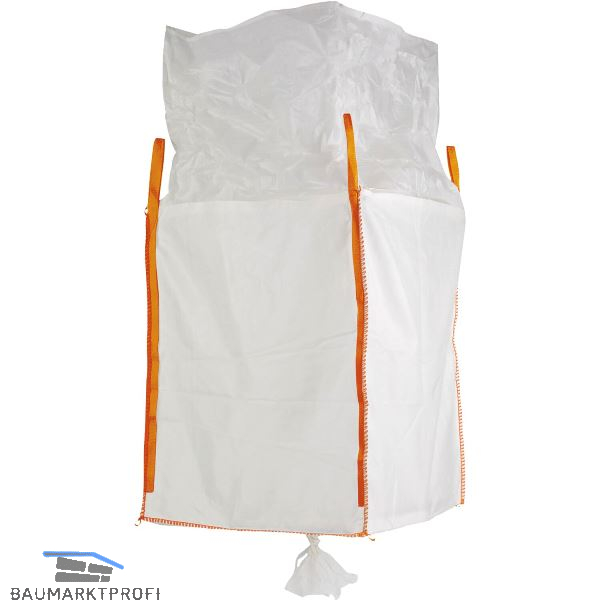 Der Containersack ist unbeschichtet und verfügt über vier Hebeschlaufen, Schürzendeckel zum Zubinden sowie Auslaufstutzen am Boden.