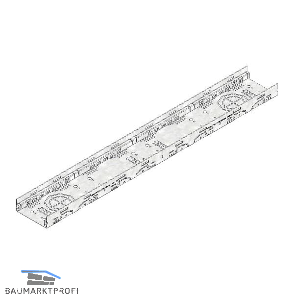 Korrosionsgeschützter verzinkter Stahl, begehbar und rollstuhlbefahrbar, Rostauflage nach innen gekantet, mit beidseitiger Perforierung sowie integrierter Perforation im Sohlbereich zum bauseitigen Ausstanzen für Kanalanschlussstutzen DN/OD 75 oder DN/OD 110. Ohne Rostauflage.