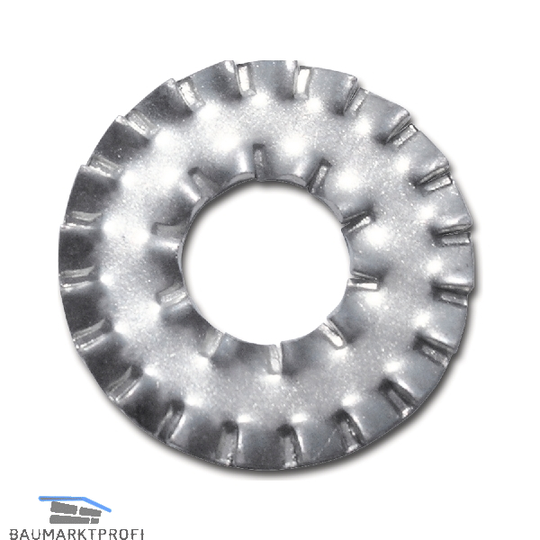 Fächerscheiben mit Doppelverzahnung, geeignet für Anwendungen bei denen der Innenlochdurchmesser wesentlich größer als der Schraubendurchmesser ist, bzw. bei Langlöchern.