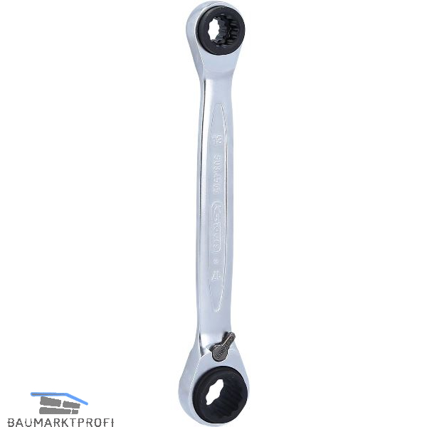 FlankTraction-Profil, gerade Form, exakt verzahnt mit 72 Zähnen, vier verschiedene Schlüsselweiten, mit Umschalthebel, sehr fein satiniert.