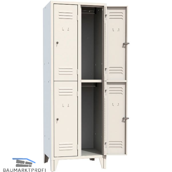 Aus Stahlblech. Oben und unten an jeder Tür Belüftungsschlitze und Vorrichtung für Namensschild. Verschlusshebel in der Mitte der Tür.
