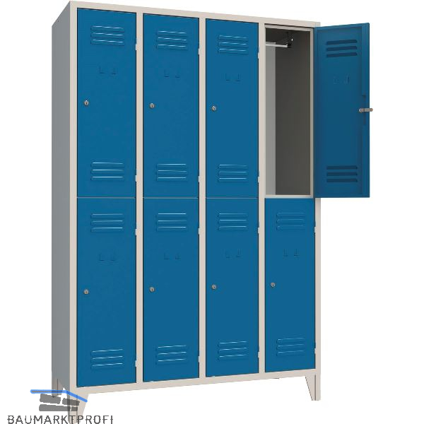 Ausstattung: 2 halbhohe Türen und Fächer übereinander. Pro Abteil 1 Kleiderstange und 2 verschiebbare Kleiderhaken.