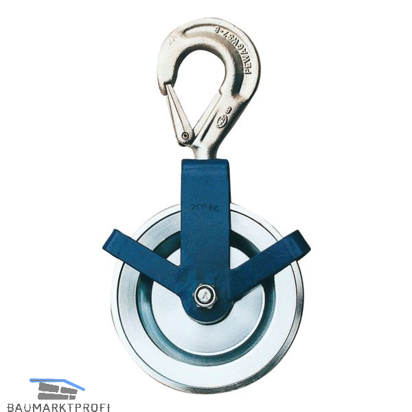 Haken geschmiedet, drehbar, galvanisch verzinkt, Gehäuse geschmiedet und verschweißt, kunststoffbeschichtet, Rolle gedreht (kein - Grauguss), gehärtet, galvanisch verzinkt.